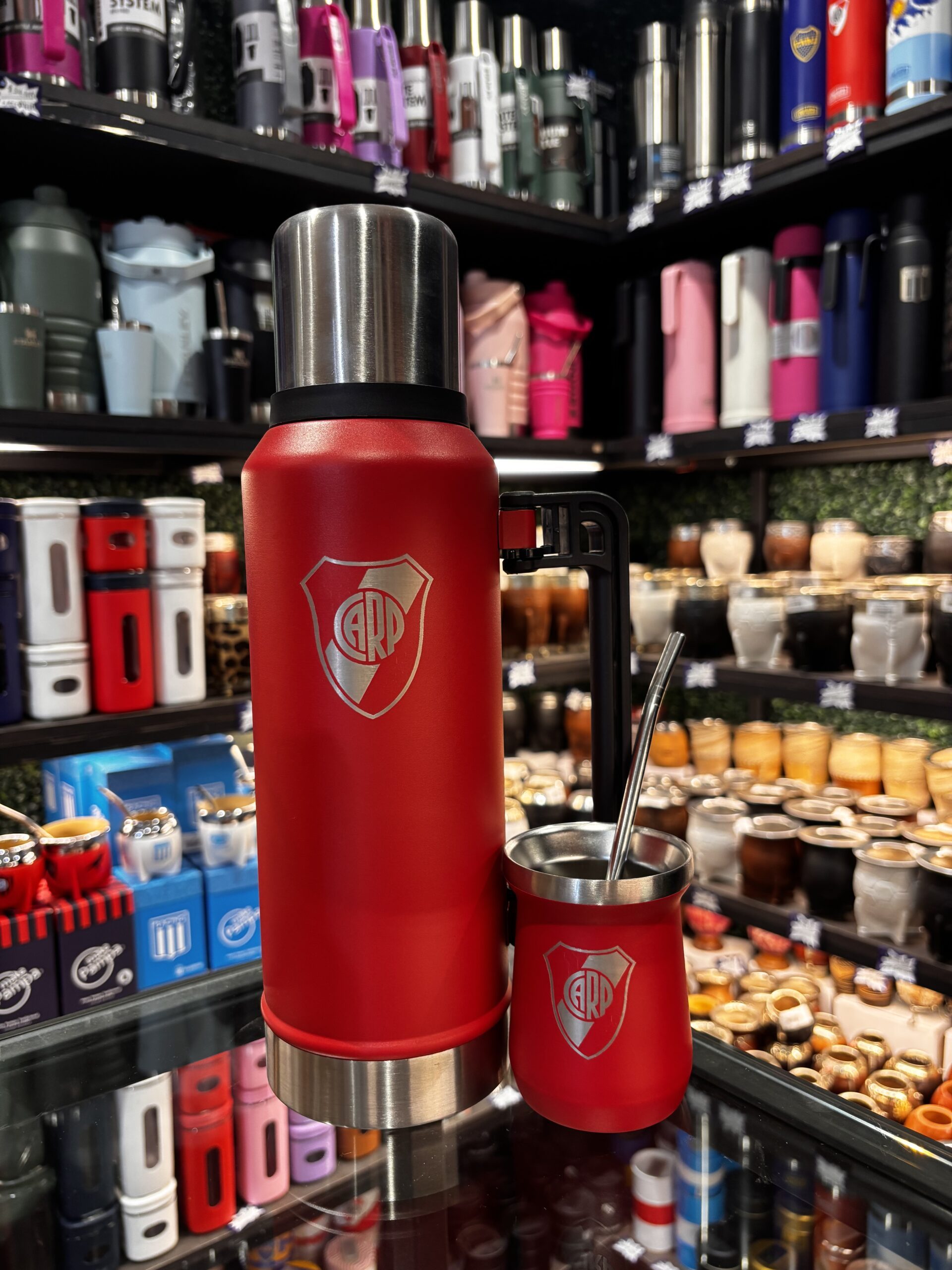 SET TERMO ACERO 1.2L CON MANIJA PLEGABLE + MATE ACERO TERMICO CLUBES cantidad