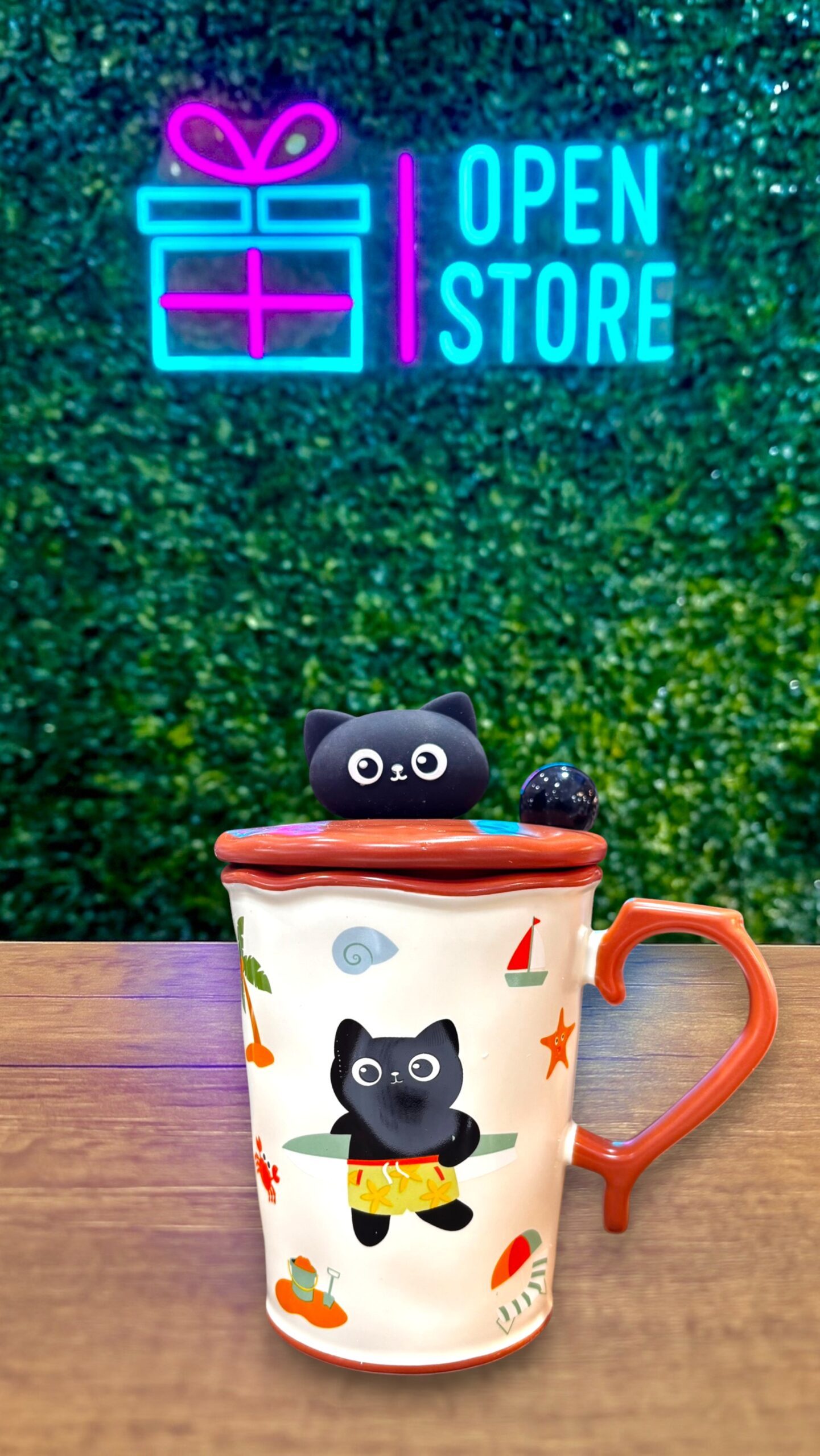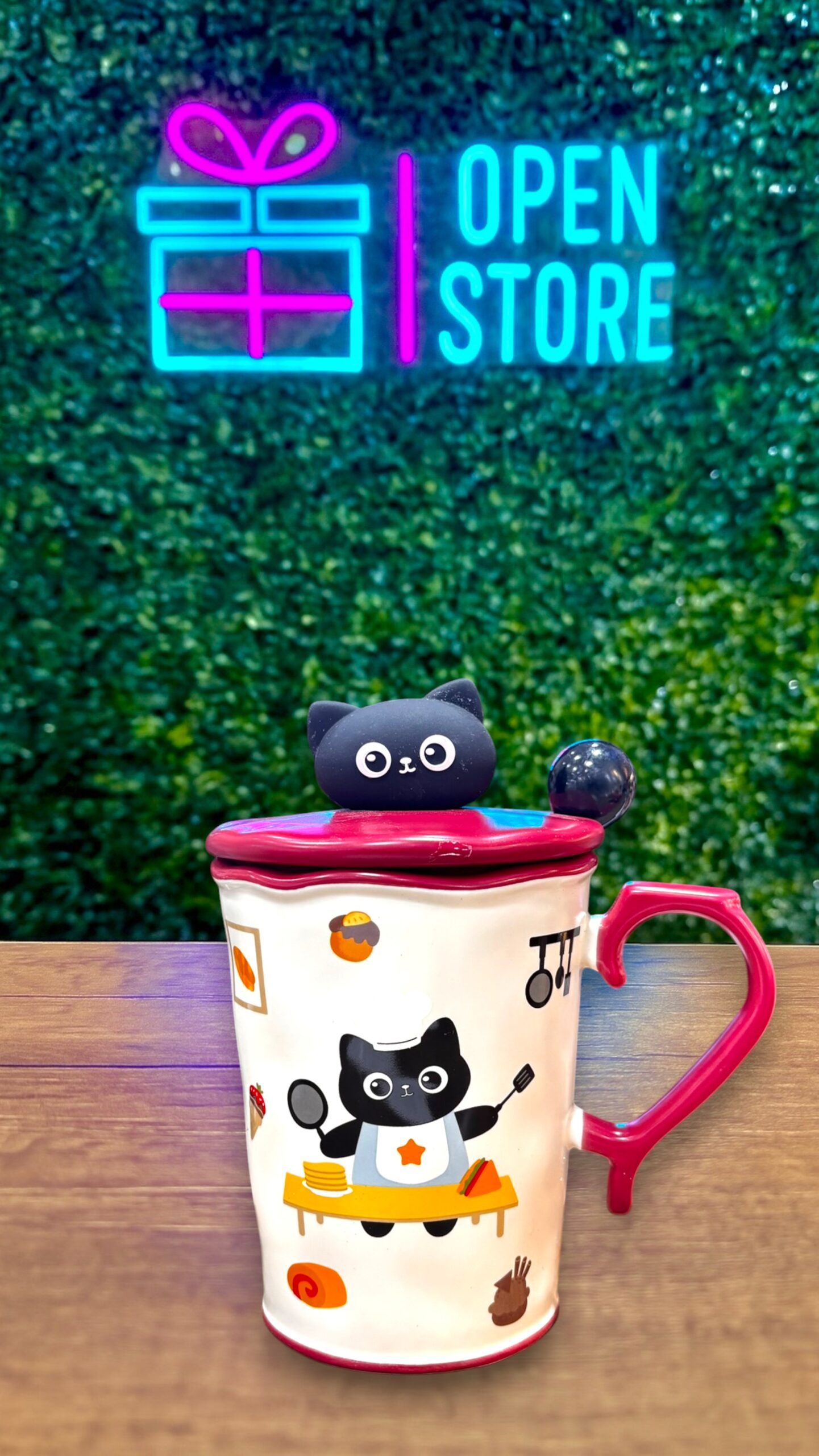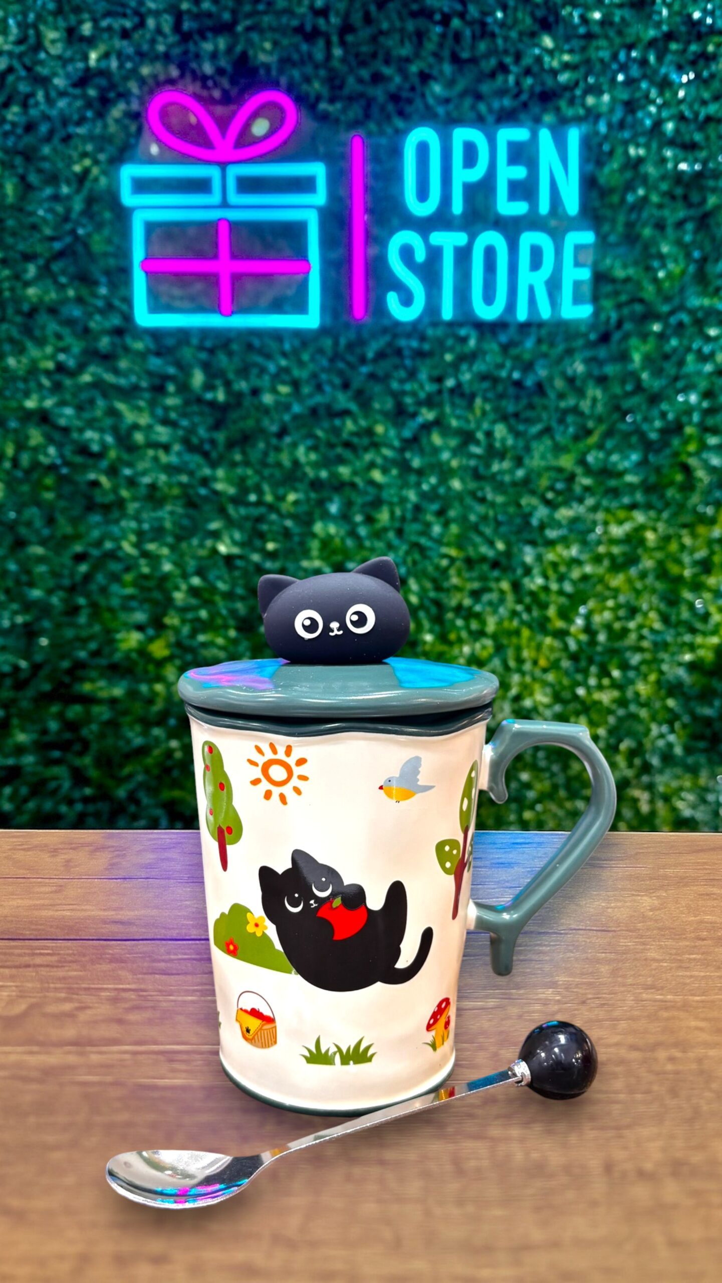 TAZA PREMIUM CON TAPA CABEZA DE GATO NEGRO + CUCHARA